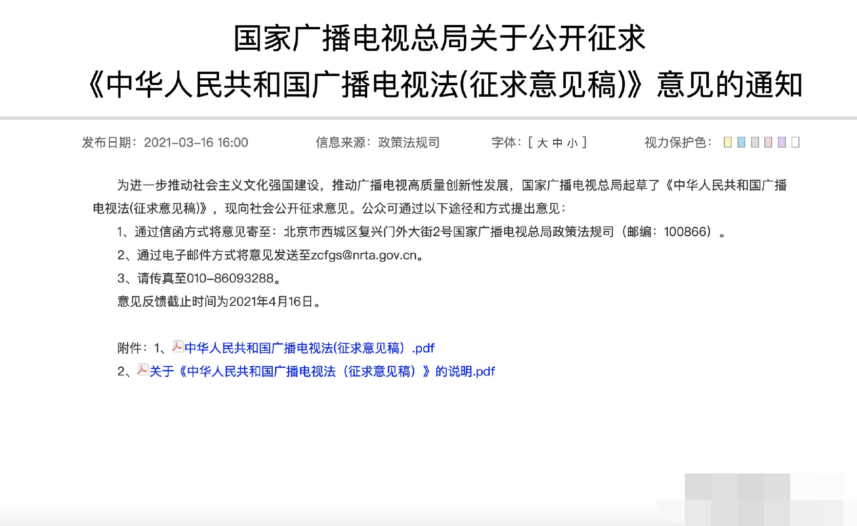 3月16日,国家广播电视总局发布关于公开征求《中华人民共和国广播电视法(征求意见稿)》意见的通知。