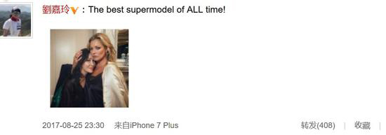 8月27日,刘嘉玲发文称:“The best supermodel of ALL time! ”并晒出一张倚靠凯特莫斯身旁的照片,显得妩媚温柔。
