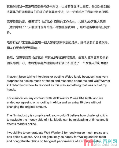 9月11日下午,《战狼2》被换女主徐嘉雯发长文回应澄清:片酬20万人民币,这当中没有任何加价!媒体朋友们被误导,网友们更容易受影响。恭喜《战狼2》有这么好的口碑和票房,也恭喜卢靖姗的精彩演出和塑造了一个女强人的好角色。这一说法与吴京的相互矛盾,难道是另有隐情?
