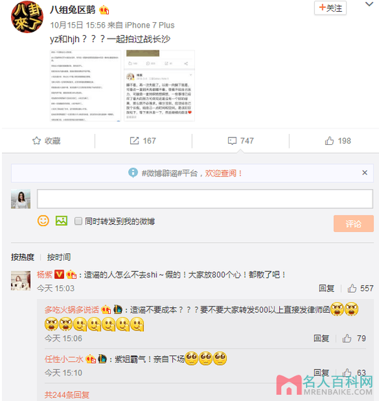 网曝霍建华和杨紫在拍摄《战长沙》期间曾经“中标怀孕”。杨紫本人在第一时间回应:“造谣的人怎么不去shi~假的!大家放800个心!都散了吧!”
