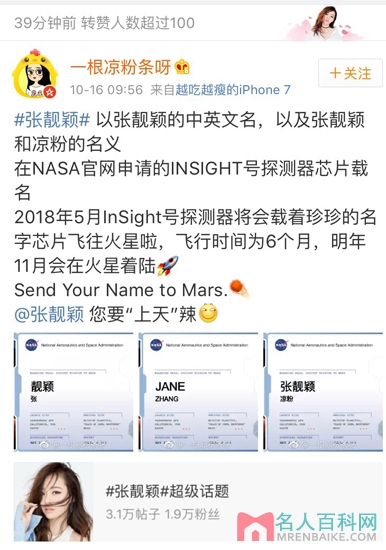 张靓颖的一位粉丝在NASA官网,以张靓颖的中英文名以及张靓颖和凉粉的名义申请了INSIGHT探测器芯片载名,2018年5月,INSIGHT号探测器将会载着张靓颖的名字飞往火星!这一次,我们张珍女士是真的要上天啦!送出如此浪漫又有新意的生日应援作为礼物,不愧是真爱粉!