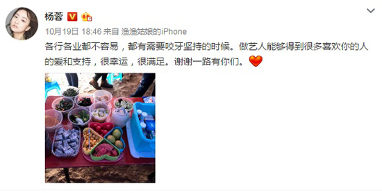 昨日,杨蓉在微博上晒出一张照片,在沙漠中的小餐桌上摆满了各种水果、蔬菜以及一个药箱,并配文:“各行各业都不容易,都有需要咬牙坚持的时候。做艺人能够得到很多喜欢你的人的爱和支持,很幸运,很满足。谢谢一路有你们。”字里行间表达了对粉丝的感谢之情。