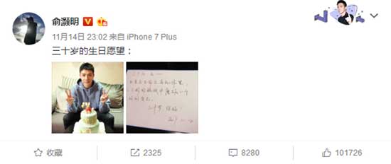 11月14日是俞灏明的生日,当天俞灏明在微博晒出一张庆生照和一封手写信,亲手为自己的而立之年写下寄语:“三十而立,就是在生命这有机体里,从不断的挑战中磨砺出一个更好的自己。三十岁,你好!” 简单真诚,始终如一。