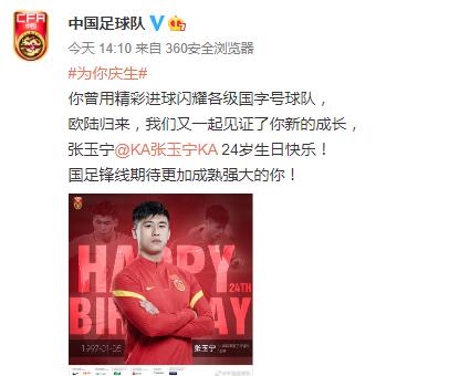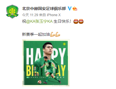 北京中赫国安发文并配图写到:祝@KA张玉宁KA 生日快乐!新赛季一起加油。