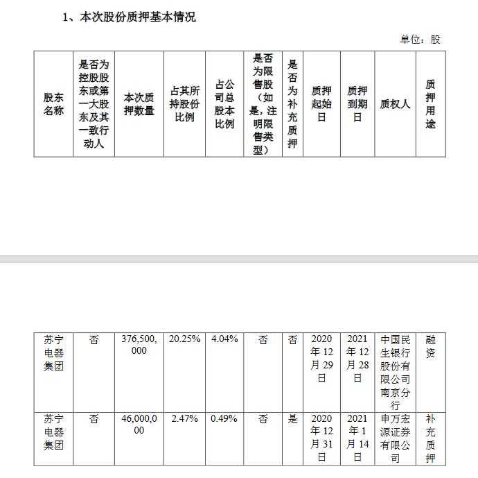 1月5日,苏宁易购集团股份有限公司发布公告,称公司股东苏宁电器集团于2020年12月29日向中国民生银行南京分行质押3.765亿股苏宁易购股票。