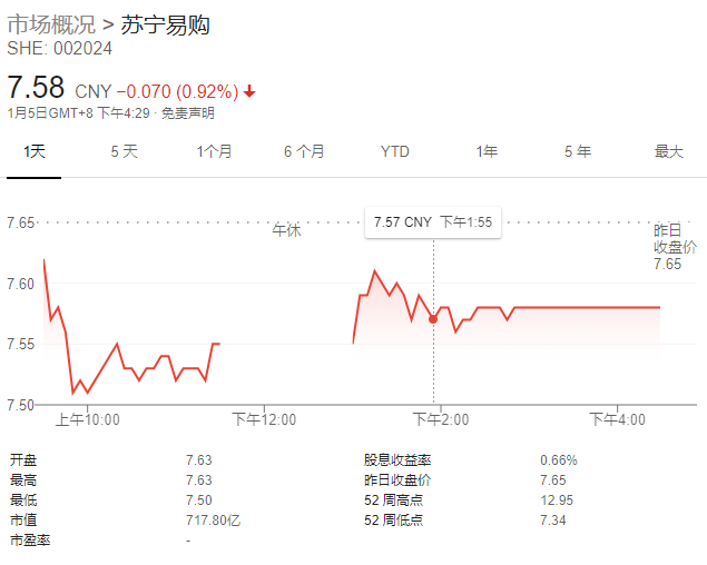 截至1月5日收盘,苏宁易购股价跌0.92%,报7.58元,公司市值为717.80亿元。