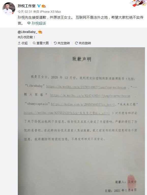 道歉人王女士在声明中写道:“2020年12月,我利用账号对外发布和评论了关于孙悦出轨的不实消息,给孙悦及其家人造成了负面影响,严重的侵犯了孙悦的名誉权。在此特向孙悦及其家人真诚致歉,我之前发布的相关信息均为不实信息。”