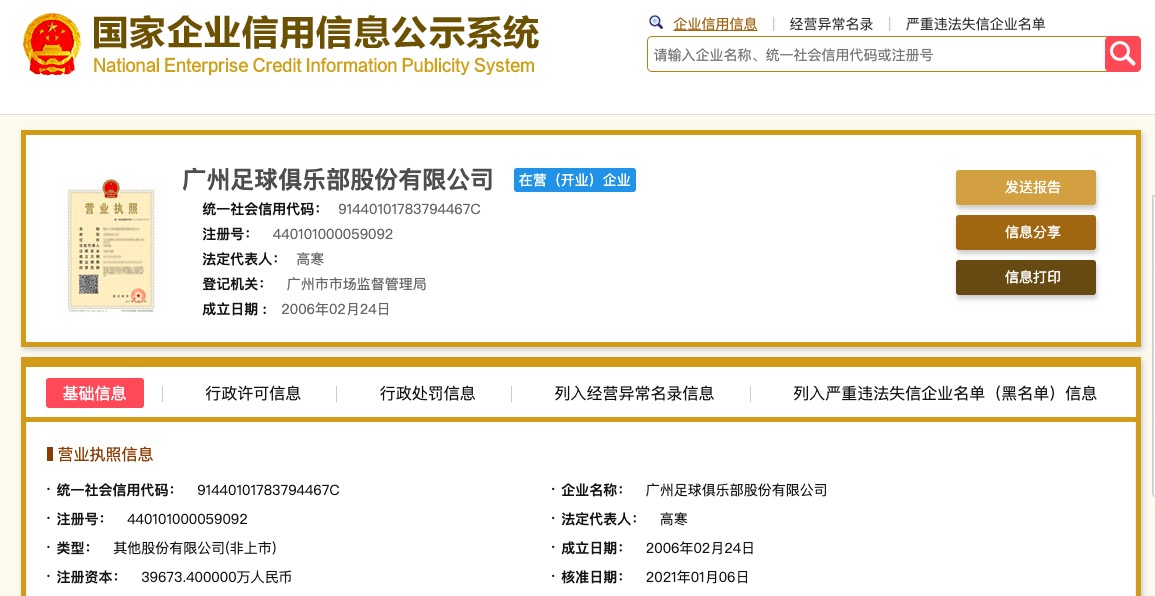 2021年1月9日,据国家企业信用信息公示系统中显示,原广州恒大淘宝俱乐部股份有限公司已经正式更名为“广州足球俱乐部股份有限公司”。此外,恒大也已向足协递交俱乐部新名称“广州队”。