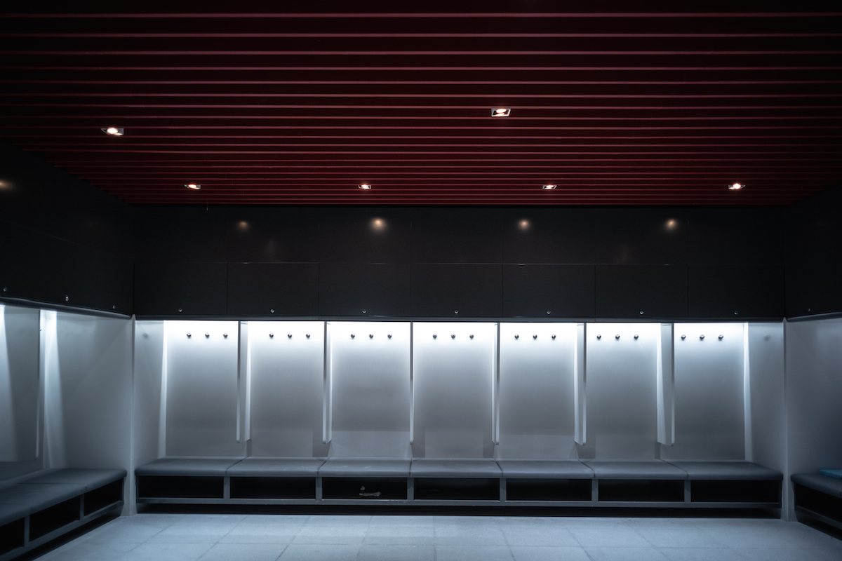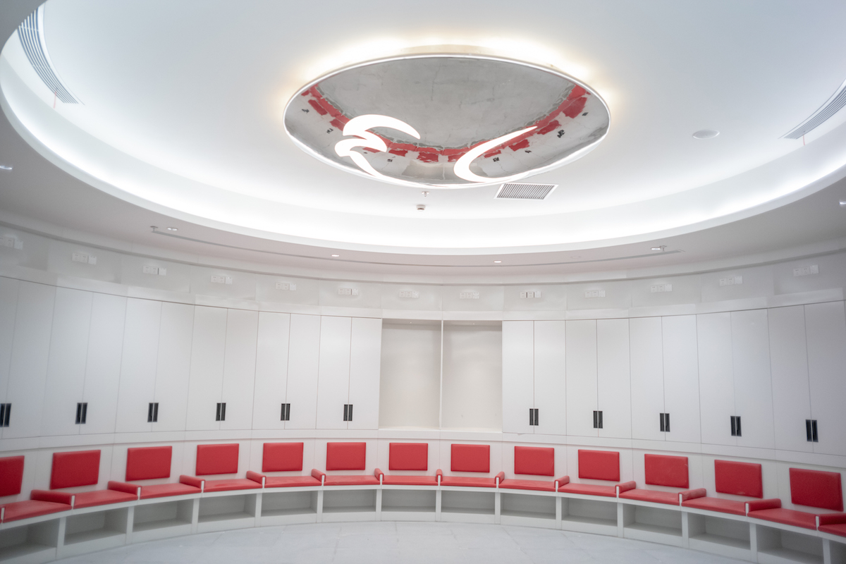 作为上港队主场的核心区域,主队更衣室首度曝光——一改传统的方形布局,取而代之的是圆形空间。更衣室以红色和白色为主色调,红色的座椅,白色的衣柜,屋顶中央有上港俱乐部队徽的鹰头标志。每个衣柜顶部还有电源插座,便于今后安装LED屏显示球员的姓名和号码。