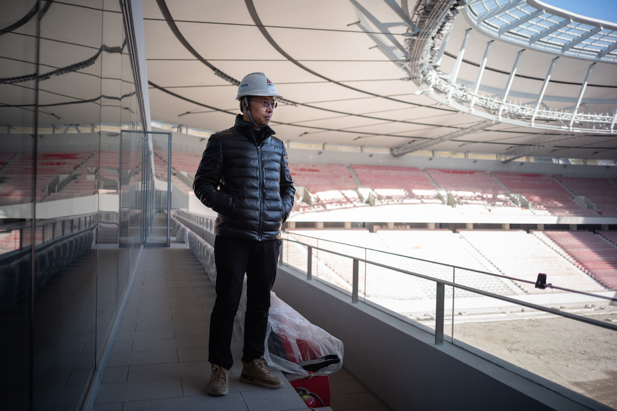 上海久事体育建设管理有限公司总工程师张汉卓察看球场施工进度