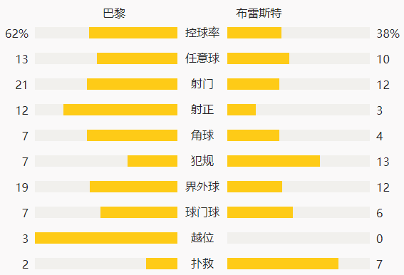 全场比赛结束,巴黎主场3-0完胜布雷斯特。