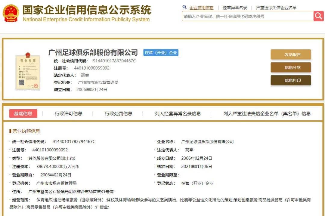 然后,足协通过,工商注册,2021年的第一个月,“广州”取代了“恒大”。