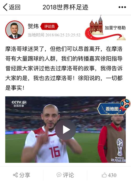 “摩洛哥球迷哭了,但他们可以昂首离开,在摩洛哥有大量踢球的人群,我们的转播嘉宾徐阳指导曾经跟大家讲过他去过摩洛哥的故事,我得告诉大家的是,我也去过摩洛哥!徐阳说的,一切都是事实!”