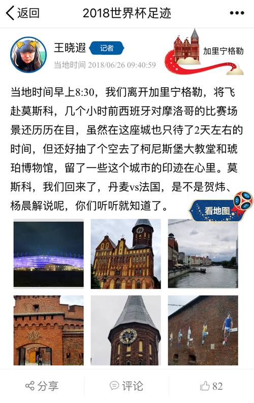 “当地时间早上8:30,我们离开加里宁格勒,将飞赴莫斯科,几个小时前西班牙对摩洛哥的比赛场景还历历在目,虽然在这座城也只待了2天左右的时间,但还好抽了个空去了柯尼斯堡大教堂和琥珀博物馆,留了一些这个城市的印迹在心里。莫斯科,我们回来了,丹麦vs法国,是不是贺炜、杨晨解说呢,你们听听就知道了。”