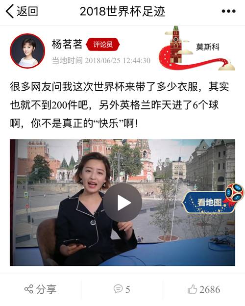 央视评论员杨茗茗:“很多网友问我这次世界杯来带了多少衣服,其实也就不到200件吧,另外英格兰昨天进了6个球啊,你不是真正的“快乐”啊!”