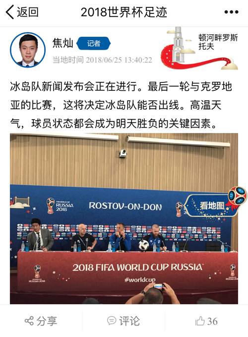 央视记者焦灿:“冰岛队新闻发布会正在进行。最后一轮与克罗地亚的比赛,这将决定冰岛队能否出线。高温天气,球员状态都会成为明天胜负的关键因素。”