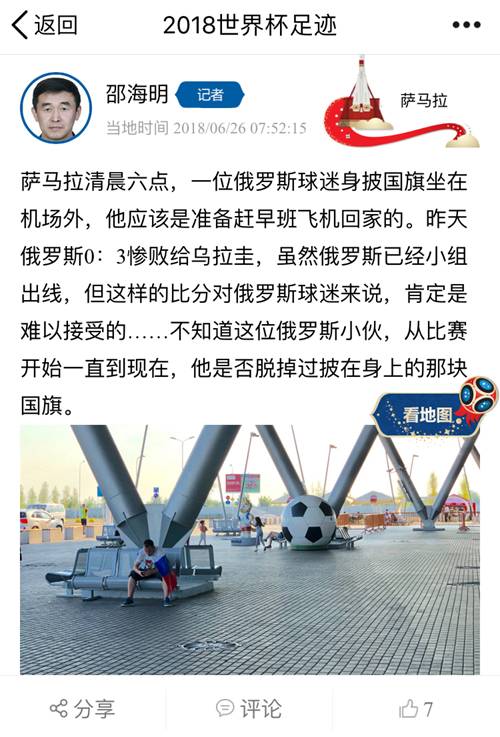 央视记者邵海明:“萨马拉清晨六点,一位俄罗斯球迷身披国旗坐在机场外,他应该是准备赶早班飞机回家的。昨天俄罗斯0:3惨败给乌拉圭,虽然俄罗斯已经小组出线,但这样的比分对俄罗斯球迷来说,肯定是难以接受的……不知道这位俄罗斯小伙,从比赛开始一直到现在,他是否脱掉过披在身上的那块国旗。”