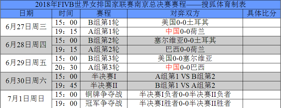 女排世联总决赛六强首先是被为两个小组,于6月27-29日各自展开单循环角逐,A组包括东道主中国女排(分站赛第9)、巴西(分站赛第3)与荷兰(分站赛第4),B组由美国(分站赛第1)、塞尔维亚(分站赛第2)和土耳其(分站赛第5)构成,因为各组只有3支球队会有轮空,两小组前2位挺进四强于30日进行半决赛,冠军争夺战被安排在7月1日上演。