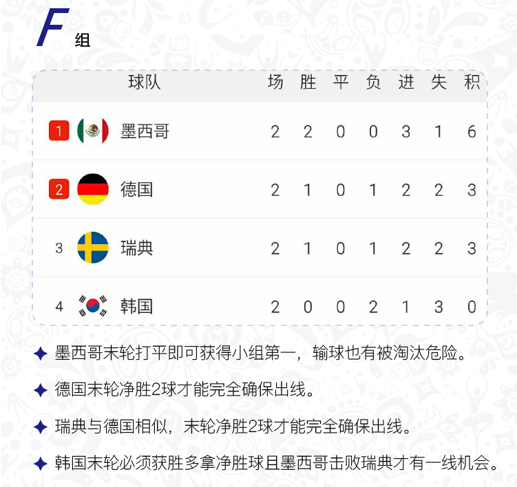 德国上轮绝杀瑞典后形势大好,但要净胜韩国两球才能确保出线,这场比赛将由刘嘉远和徐阳搭档解说。墨西哥虽然两连胜,但是仍有出局风险,对手瑞典已孤注一掷,而两连败的韩国甚至还有理论希望。