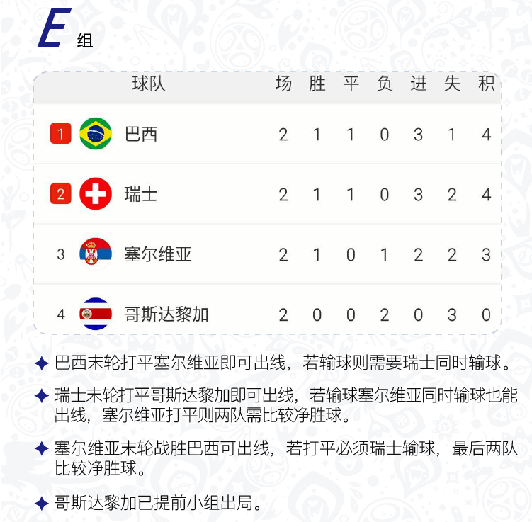 巴西打平即可出线,但要取胜才能确保头名,瑞士队打平此前出局的哥斯达黎加即可出线,塞尔维亚则必须击败巴西。本组最大的悬念在于五星巴西能否拿下头名?他们是否会在淘汰赛中与德国提前相遇?一切都是未知数。巴西队的比赛将由曾侃单口解说。