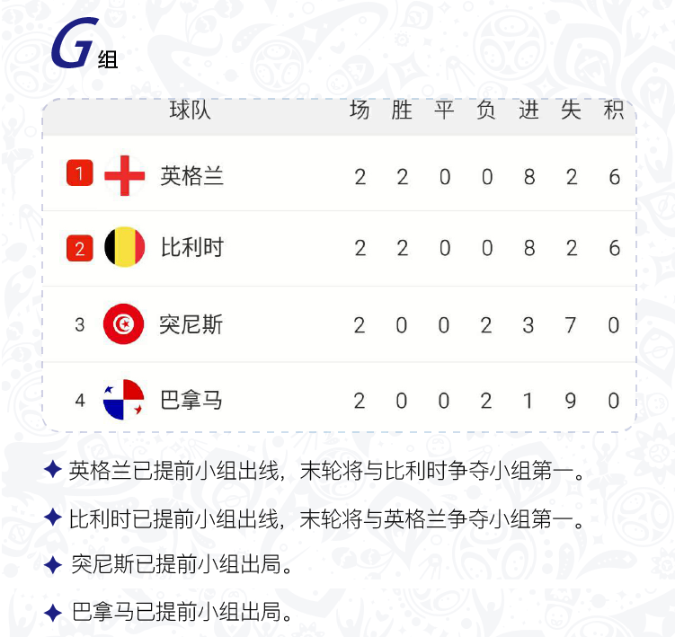 英格兰与比利时的强势让G组的出线形势也早早水落石出,悬念在于英格兰与比利时两支被球迷称为“快乐足球”的球队谁能拿到头名,获得一个不错的对阵以及半区,这场比赛将由曾侃和杨晨搭档解说。
