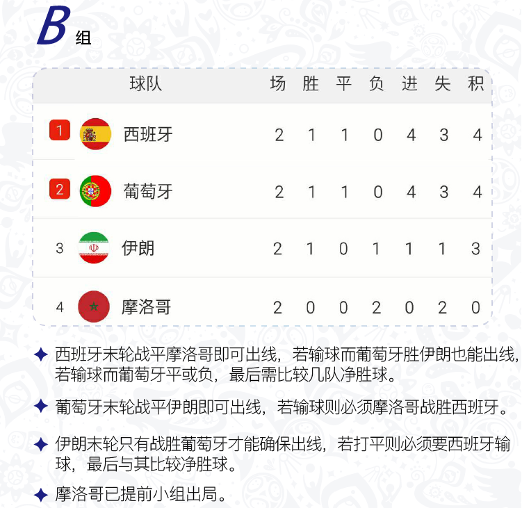 西班牙与葡萄牙的积分和净胜球都一致,两队若双双获胜则携手出线,主要看净胜球、进球数多少甚至红黄牌来决定谁是头名。但两队如果出现意外,伊朗和摩洛哥的搅局或许会让出线变得复杂。葡萄牙队的比赛将由刘嘉远单口解说,西班牙队的比赛则由贺炜单口解说。