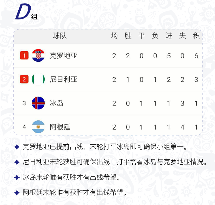 D组最大的焦点无疑是目前垫底的阿根廷队能否起死回生,他们必须孤注一掷战胜尼日利亚,才有机会逆袭出线,这场比赛将由洪钢单口解说。阿根廷的对手尼日利亚取胜可确保出线,克罗地亚打平可确保出线,冰岛取胜也还有机会,死亡之组的悬念要等到最后一刻才能揭晓。