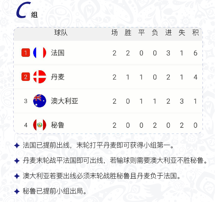 C组目前法国提前出线,秘鲁提前出局,变数在于只有丹麦输球而澳大利亚赢球,澳大利亚才有机会逆转丹麦。法国与丹麦将会上演一场焦点大战,此战将由贺炜和杨晨搭档解说。