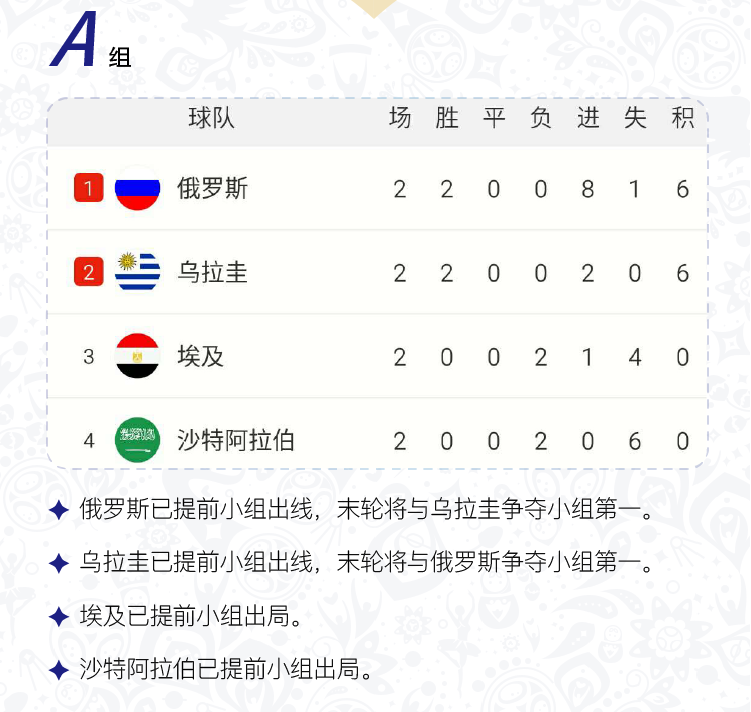 A组的出线局势已提前揭晓,俄罗斯与乌拉圭提前出线,埃及与沙特提前出局,最大悬念就是俄罗斯与乌拉圭谁将成为小组头名?东道主打平即可头名出线,这场比赛将由曾侃与徐阳搭档评述。