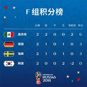 本轮战罢,F组出现了非常有趣的一幕。尽管墨西哥豪取两连胜高居小组第一,但他们并未确定晋级。而两连败的韩国队也还有一丝生机。最后一轮,一旦出现德国战胜韩国,瑞典战胜墨西哥的情况。那么三支同积六分的球队将形成超级连环套,净胜球、总进球数、相互胜负关系甚至通过抽签确定出线名额的情况都有可能出现。