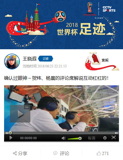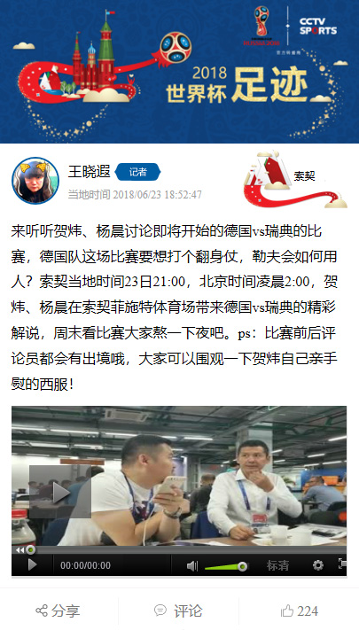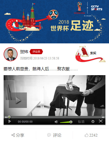 北京时间6月24日凌晨2点,在索契的菲什特体育场,世界杯F组德国队与瑞典队展开焦点对决。本场比赛在现场评论席上,四年前曾解说德国夺冠的评论员贺炜与曾在德甲留洋的前国脚杨晨搭档。不过赛前还发生了一件有意思的花絮,在世界杯足迹平台中,贺炜发布了自己亲手熨衣服的短视频,而他也正是穿着自己亲手熨的衣服前往了现场。