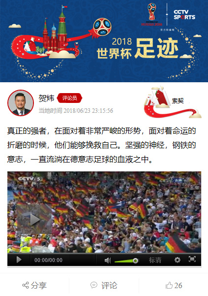 终场结束,贺炜称赞德国,“德国人挽救了自己!一个真正的强者,在面对着非常严峻的形势,面对着命运的折磨的时候,他们能够挽救自己,他们有坚强的神经,钢铁一般的意志,一直流淌在德意志足球的血液之中,一直深嵌在他们的基因之中。对德国足球来讲,胜利早已成为一种习惯,而如今,没有任何事情是理所应当的,每个人都该为自己想到达到的目标拼尽全力。”