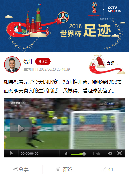 最后,贺炜诗意的点缀了这场经典之战,“如果您看完了今天的比赛,您再推开窗,能够帮助您去面对明天真实的生活的话,我觉得,看足球就值了。”