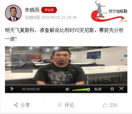 6月23日20:00,央视评论员朱晓雨将在莫斯科解说比利时与突尼斯的比赛。