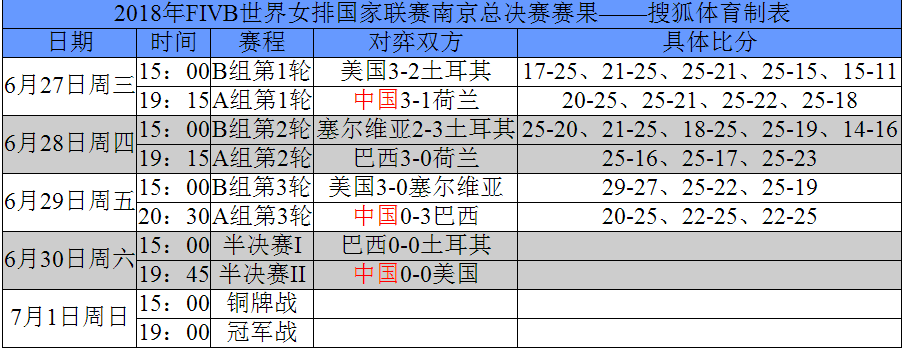 6月30日,2018年女排世联赛结束分组赛角逐,中国女排力拼三局以0-3遭巴西零封,名列A组第2携手头名巴西晋级四强,奥运冠军刘亚男、徐云丽、惠若琪和张常宁等到现场观战,半决赛对阵敲定为中国女排过招美国、巴西交锋土耳其。主教练郎平看淡中国女排的一时胜负,点评对垒巴西在进攻和拦防两环节存在漏洞,队长朱婷释疑第二局丢分在于轮次。