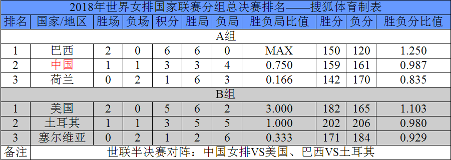 截止到世联分组赛全部结束,A组巴西2胜0负6分高居榜首,携手位居次席的中国女排1胜1负3分晋级四强,B组美国2胜0负5分搭档土耳其1胜1负3分出线,反观荷兰0胜2负1分与塞尔维亚0胜2负1分被淘汰出局。至此,世联半决赛的对阵形势正式出炉,分别是中国女排(A组第2)VS美国(B组第1)、而巴西(A组第1)VS土耳其(B组第2)。(丰木易)