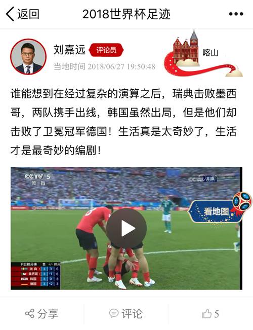 “谁能想到在经过复杂的演算之后,瑞典击败墨西哥,两队携手出线,韩国虽然出局,但是他们却击败了卫冕冠军德国!生活真是太奇妙了,生活才是最奇妙的编剧!”