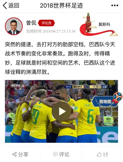 “突然的提速,去打对方的肋部空档,巴西队今天战术节奏的变化非常奏效。跑得及时,传得精妙,足球就是时间和空间的艺术,巴西队这个进球诠释的淋漓尽致。”