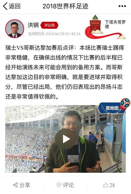 央视评论员洪钢对瑞士战平哥斯达黎加的比赛做出了点评,除了恭喜稳健的瑞士出线之外,还为虽然已经出局但仍然斗志昂扬的哥斯达黎加点赞。