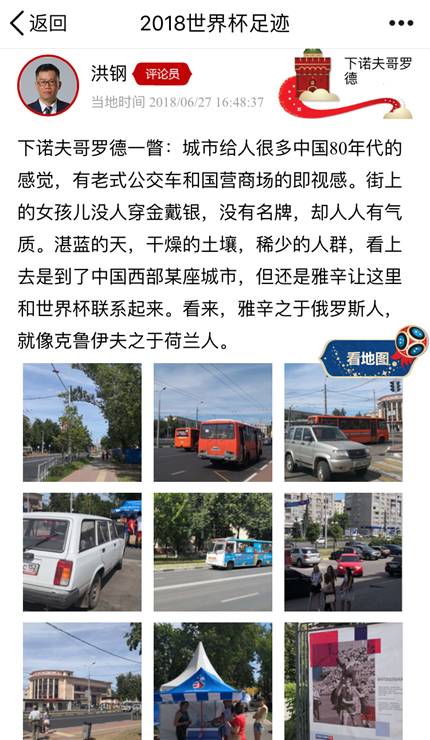 央视评论员洪钢:“下诺夫哥罗德一瞥:城市给人很多中国80年代的感觉,有老式公交车和国营商场的即视感。街上的女孩儿没人穿金戴银,没有名牌,却人人有气质。湛蓝的天,干燥的土壤,稀少的人群,看上去是到了中国西部某座城市,但还是雅辛让这里和世界杯联系起来。看来,雅辛之于俄罗斯人,就像克鲁伊夫之于荷兰人。”