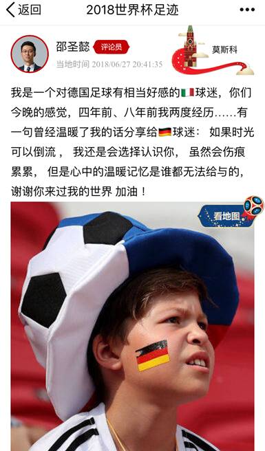央视评论员邵圣懿:“我是一个对德国足球有相当好感意大利球迷,你们今晚的感觉,四年前、八年前我两度经历……有一句曾经温暖了我的话分享给德国球迷: 如果时光可以倒流 , 我还是会选择认识你, 虽然会伤痕累累, 但是心中的温暖记忆是谁都无法给与的, 谢谢你来过我的世界 加油 !”