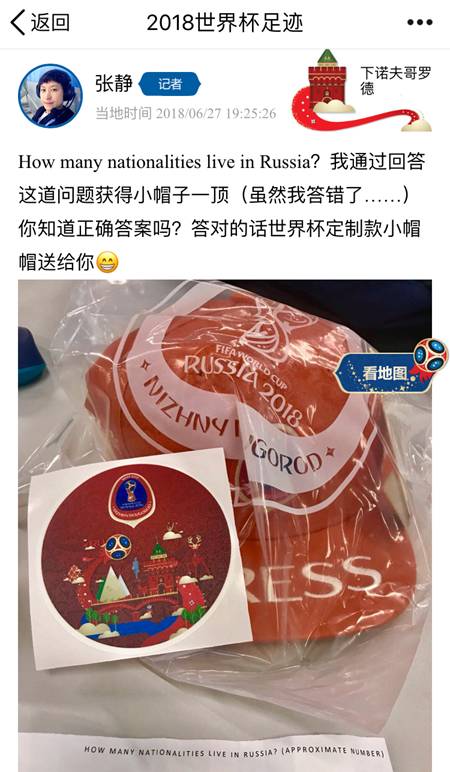 央视记者张静:“How many nationalities live in Russia?我通过回答这道问题获得小帽子一顶(虽然我答错了……)你知道正确答案吗?答对的话世界杯定制款小帽帽送给你”