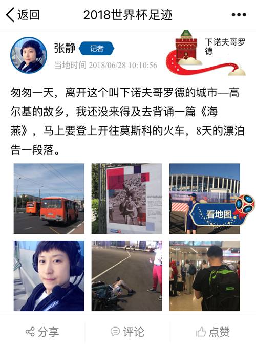 央视记者张静:“匆匆一天,离开这个叫下诺夫哥罗德的城市—高尔基的故乡,我还没来得及去背诵一篇《海燕》,马上要登上开往莫斯科的火车,8天的漂泊告一段落。”