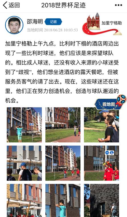 央视记者邵海明:“加里宁格勒上午九点,比利时下榻的酒店周边出现了一些比利时球迷,他们应该是来探望球队的。相比成人球迷,还没有收入来源的小球迷受到了“歧视”,他们想坐进酒店的露天餐吧,但被服务员客气的请了出去。现在,这些球迷还在这里,他们正在努力创造机会,创造与球队邂逅的机会。”