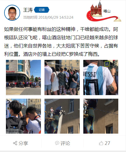 淘汰赛首战法国与阿根廷之间的较量将于北京时间今晚22点进行。阿根廷队提前一天抵达比赛举行地喀山,比他们到来更早的是阿根廷队的球迷。中央电视台俄罗斯世界杯报道组记者王涛在现场评述到:“在阿根廷队还没有到来的时候,来自世界各地的阿根廷队球迷早就聚集到球队下榻的酒店门口等待。这几天,喀山的天气炎热,但这丝毫没有影响到球迷们的热情。他们在酒店门口选择有利的位置,等待球员签名。在酒店对面楼的墙上,工作人员正抓紧时间绘制梅西的头像,希望梅西到来的时候,能看到自己的画像。”
