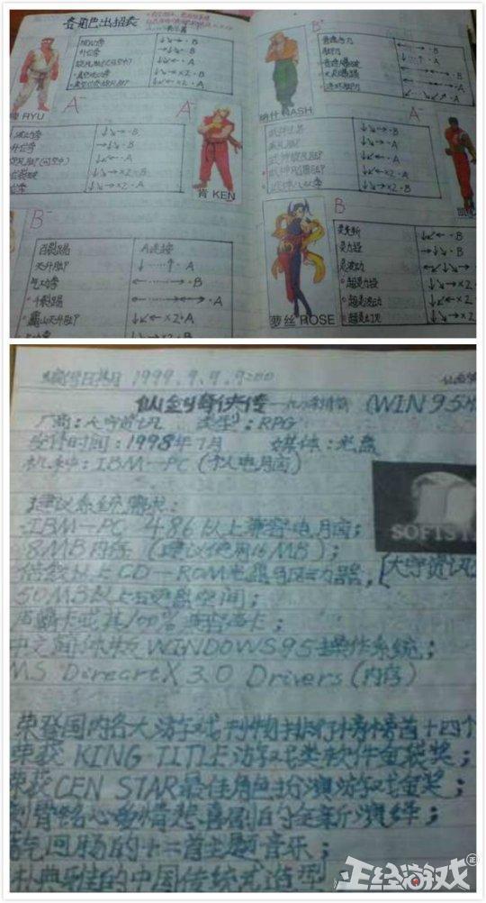 网友“半夜削苹果”在网上分享了自己在小学生时候制作的游戏秘籍,全套秘籍基本上把那个年代最火的几款游戏都囊括其中了,如《街头霸王》,《实况足球》,《合金弹头》,仙剑等等。秘籍从简单的街霸人物出招表,到详细到写有电脑配置要求的仙剑1攻略,手绘实况足球球员能力数值柱状图等等游戏内容都一一编写了下来。