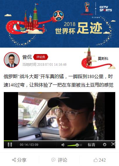 开赛前,曾侃在前往比赛场馆的路上,体验了俄罗斯“战斗司机”驾驶的汽车。“一脚踩到180、时速140过弯、第一视角、全程高能。”曾侃在“世界杯足迹”平台上这样点评俄式“速度与激情”:“体验了一把在车里被当土豆甩的感觉。”