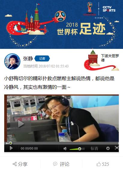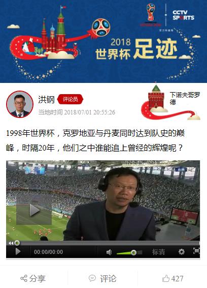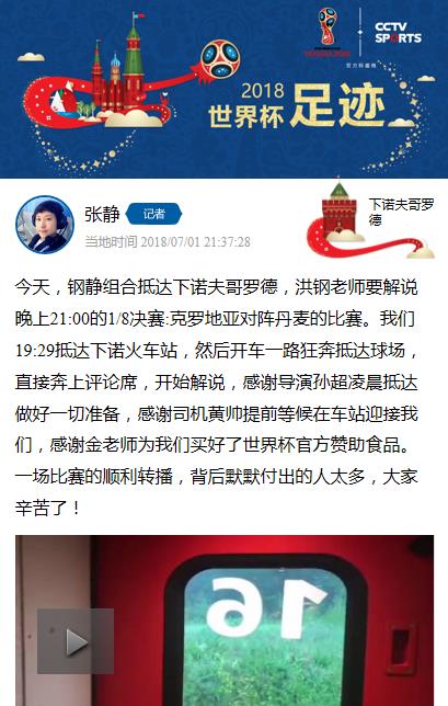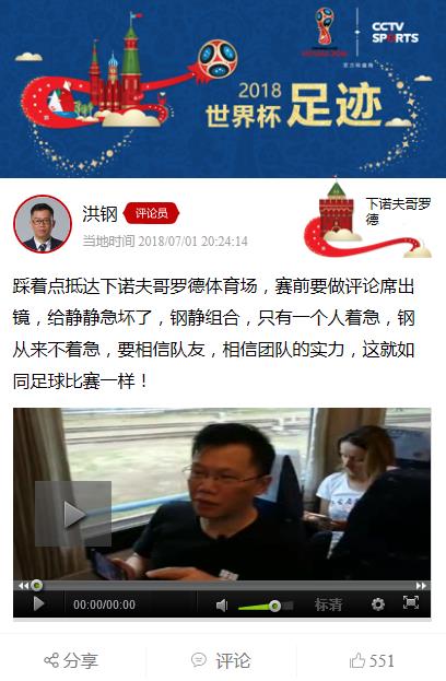 我们在屏幕前见证了紧张激烈的比赛,也听到了评论员们精彩的评述。在“世界杯足迹”平台,可以看到他们在前往评论席过程中的诸多经历。曾侃体验汽车超速,洪钢遭遇冰雹火车晚点,还有那些席地而眠的时刻。每一场精彩评论背后,都有前方团队许多人的汗水。希望世界杯接下来的比赛越来越精彩,也希望能听到评论员们更多金句妙语,让我们一同享受足球带来的快乐。