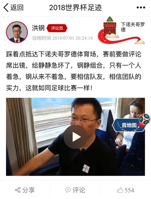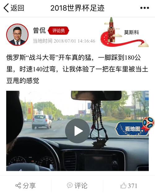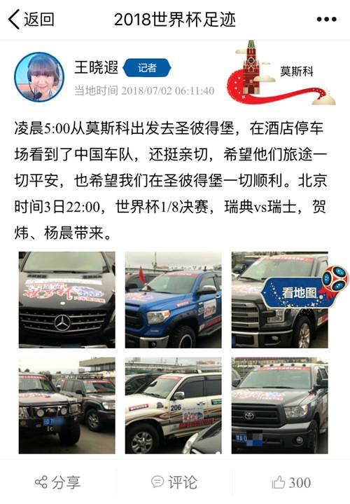 央视记者王晓遐:“凌晨5:00从莫斯科出发去圣彼得堡,在酒店停车场看到了中国车队,还挺亲切,希望他们旅途一切平安,也希望我们在圣彼得堡一切顺利。北京时间3日22:00,世界杯1/8决赛,瑞典vs瑞士,贺炜、杨晨带来。”