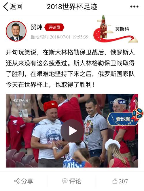 央视评论员贺炜在东道主俄罗斯战胜西班牙的赛后评论,俄罗斯人自二战之后从未如此疲惫,但他们的顽强战胜了实力强大的西班牙队,创造了历史,他们的球迷有理由为他们的国家队欢呼!